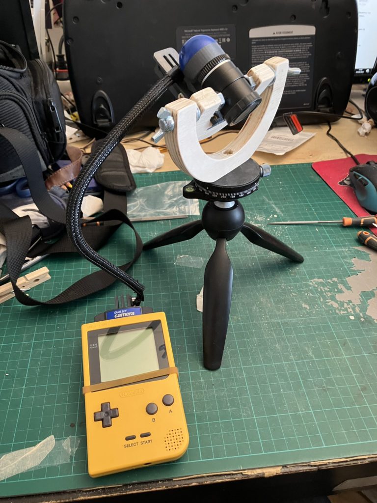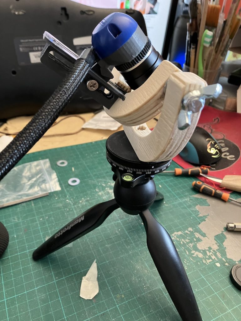 In practice, the nodal point is really hard to find because of the low resolution, so I mostly eyeball the position of the lens. The mount is however useful to shoot pictures with even angle increments, both vertically and horizontally.