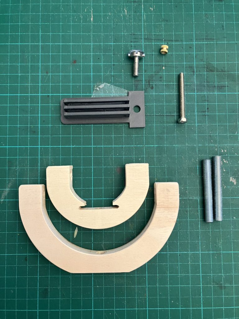The design allows to adjust the position of the mounting point of the lens (represented in green), using a screw on the 3D-printed part (pink). The wooden parts (yellow) allows for the rotation around the horizontal axis, while the off the shelf ring mount allows for rotation around the vertical axis